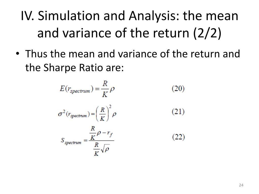 IV. Simulation and Analysis: the mean and variance of the return (2/2) • Thus the mean and variance of the return and the Sharpe Ratio are: