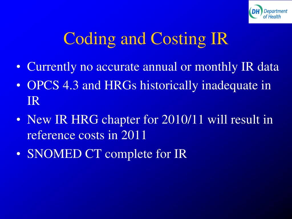 Coding and Costing IR • Currently no accurate annual or monthly IR data • OPCS 4.3 and HRGs historically inadequate in IR • New IR HRG chapter for 2010/11 will result in reference costs in 2011 • SNOMED CT complete for IR