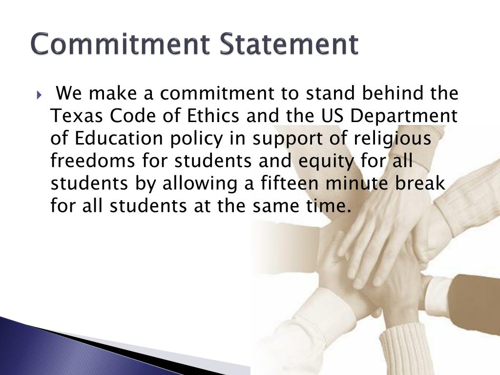 Commitment Statement • We make a commitment to stand behind the Texas Code of Ethics and the US Department of Education policy in support of religious freedoms for students and equity for all students by allowing a fifteen minute break for all students at the same time.