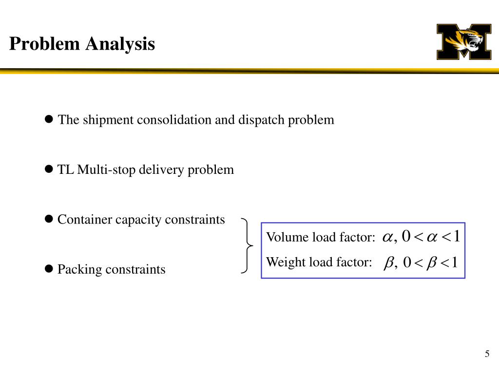 Problem Analysis • The shipment consolidation and dispatch problem • TL Multi-stop delivery problem • Container capacity constraints • Packing constraints Volume load factor: Weight load factor: