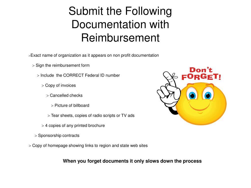 Submit the Following Documentation with Reimbursement Exact name of organization as it appears on non profit documentation Sign the reimbursement form Include the CORRECT Federal ID number Copy of invoices Cancelled checks Picture of billboard Tear sheets, copies of radio scripts or TV ads 4 copies of any printed brochure Sponsorship contracts Copy of homepage showing links to region and state web sites When you forget documents it only slows down the process