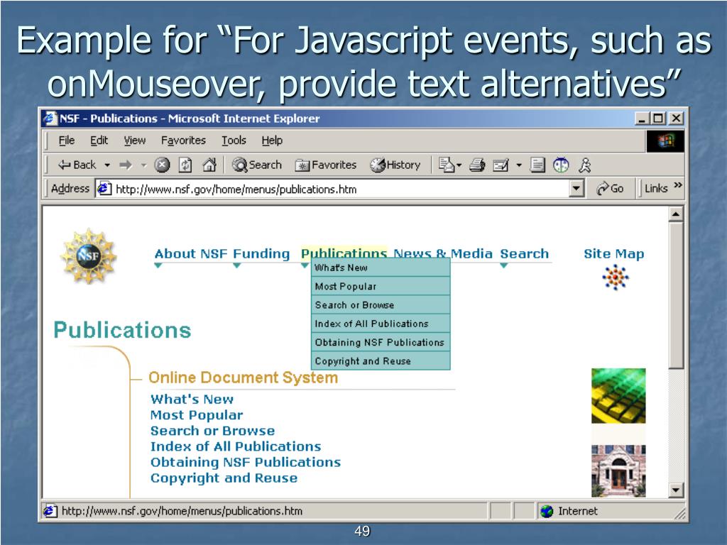 Example for “For Javascript events, such as onMouseover, provide text alternatives”