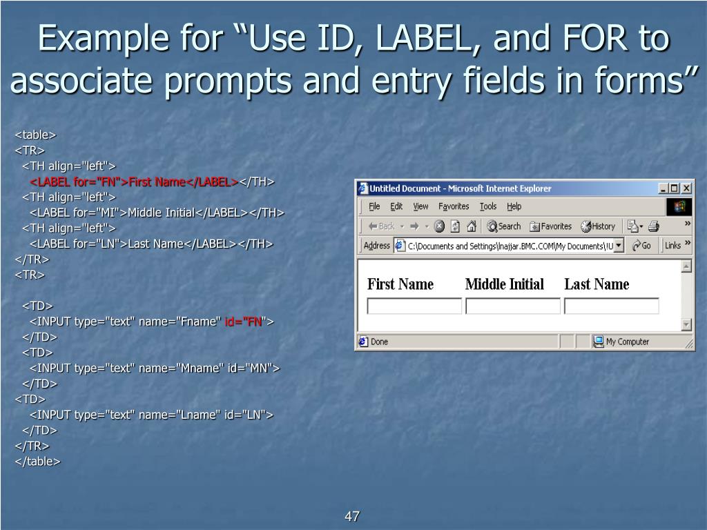 Example for “Use ID, LABEL, and FOR to associate prompts and entry fields in forms” <table> <TR> <TH align="left"> <LABEL for="FN">First Name</LABEL></TH> <TH align="left"> <LABEL for="MI">Middle Initial</LABEL></TH> <TH align="left"> <LABEL for="LN">Last Name</LABEL></TH> </TR> <TR> <TD> <INPUT type="text" name="Fname" id="FN"> </TD> <TD> <INPUT type="text" name="Mname" id="MN"> </TD> <TD> <INPUT type="text" name="Lname" id="LN"> </TD> </TR> </table>