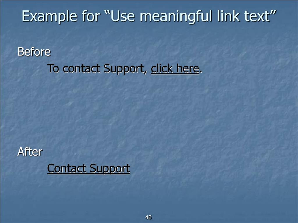 Example for “Use meaningful link text” Before To contact Support, click here. After Contact Support