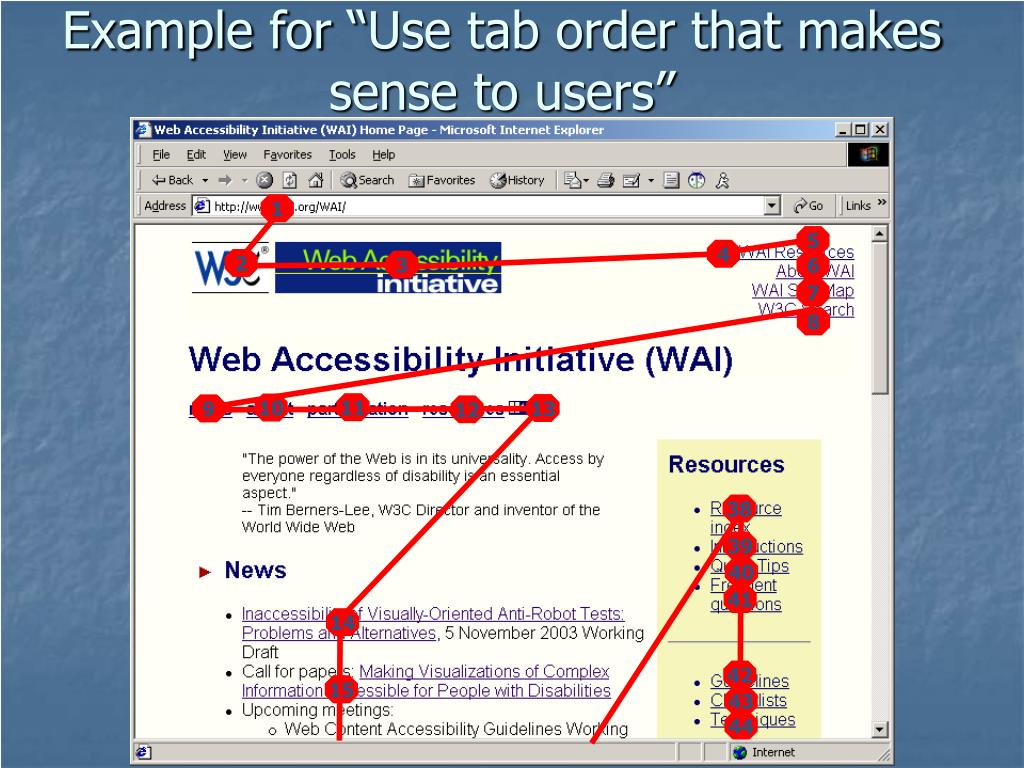 Example for “Use tab order that makes sense to users” 1 5 4 2 3 6 7 8 11 10 13 9 12 38 39 40 41 14 42 15 43 44