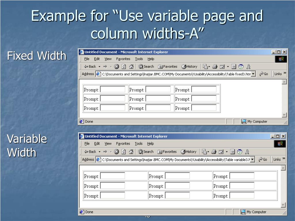 Example for “Use variable page and column widths-A” Fixed Width Variable Width