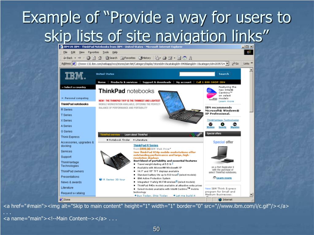 Example of “Provide a way for users to skip lists of site navigation links” <a href="#main"><img alt="Skip to main content" height="1" width="1" border="0" src="//www.ibm.com/i/c.gif"/></a> . . . <a name="main"><!--Main Content--></a> . . .