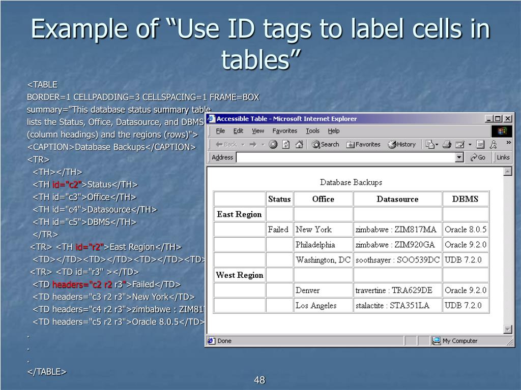 Example of “Use ID tags to label cells in tables” <TABLE BORDER=1 CELLPADDING=3 CELLSPACING=1 FRAME=BOX summary="This database status summary table lists the Status, Office, Datasource, and DBMS (column headings) and the regions (rows)"> <CAPTION>Database Backups</CAPTION> <TR> <TH></TH> <TH id="c2">Status</TH> <TH id="c3">Office</TH> <TH id="c4">Datasource</TH> <TH id="c5">DBMS</TH> </TR> <TR> <TH id="r2">East Region</TH> <TD></TD><TD></TD><TD></TD><TD></TD></TR> <TR> <TD id="r3" ></TD> <TD headers="c2 r2 r3">Failed</TD> <TD headers="c3 r2 r3">New York</TD> <TD headers="c4 r2 r3">zimbabwe : ZIM817MA</TD> <TD headers="c5 r2 r3">Oracle 8.0.5</TD></TR> . . . </TABLE>