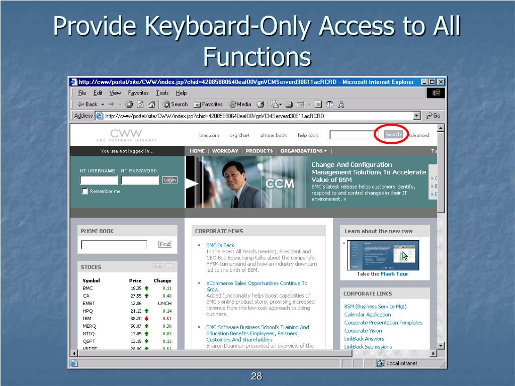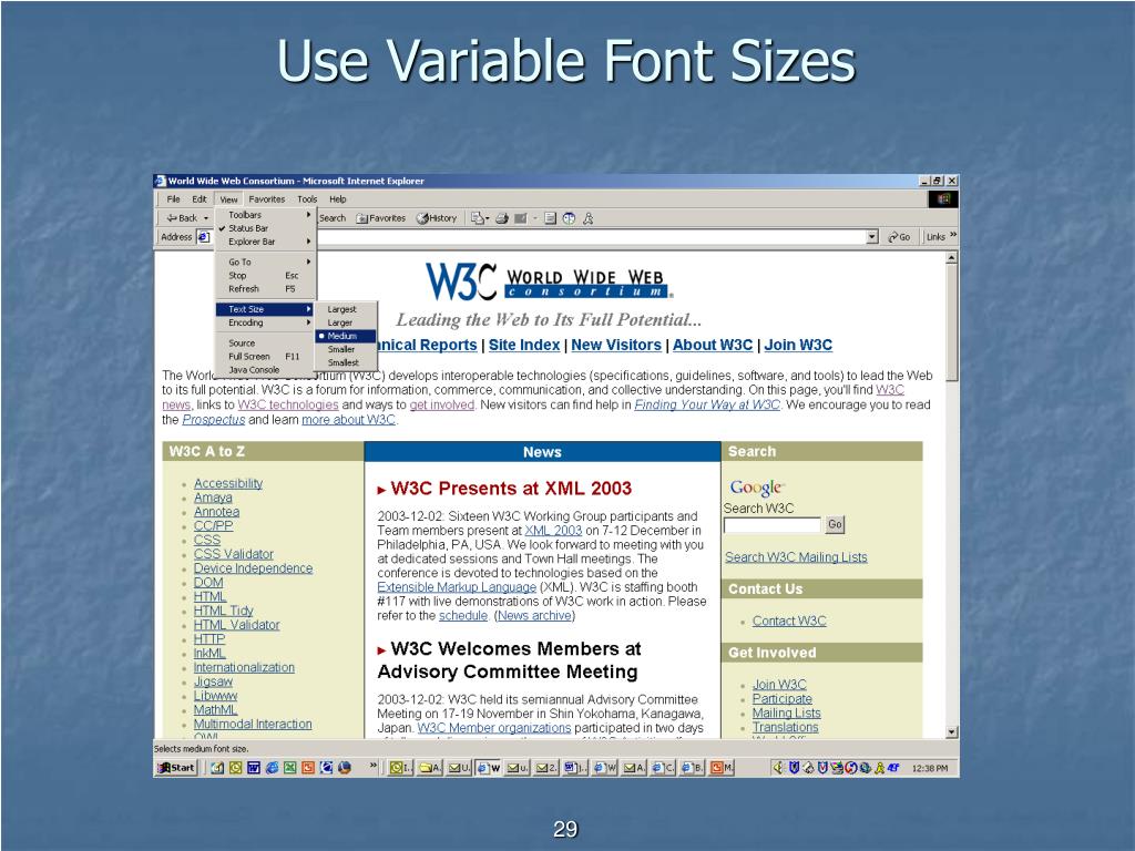 Some Accessibility Suggestions • Use cascading style sheets (example) • Provide high contrast for text (example) • Use variable page and column widths (example) • Use tab order that makes sense to users (example) • Use meaningful link text (example) • Use ID, LABEL, and FOR to associate prompts and entry fields in forms (example) • Use ID tags to label cells in tables (example) • For Javascript events, such as onMouseover, provide text alternatives (example) • Provide a way for users to skip lists of site navigation links (example) • Don’t use unnecessary graphics (example)
