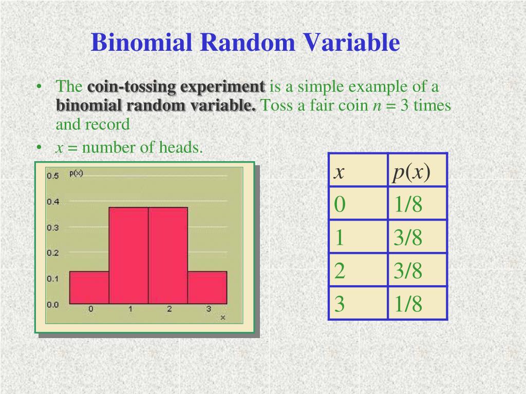 Binomial Random Variable The coin-tossing experimentis a simple example of a binomial random variable. Toss a fair coin n = 3 times and record x = number of heads.