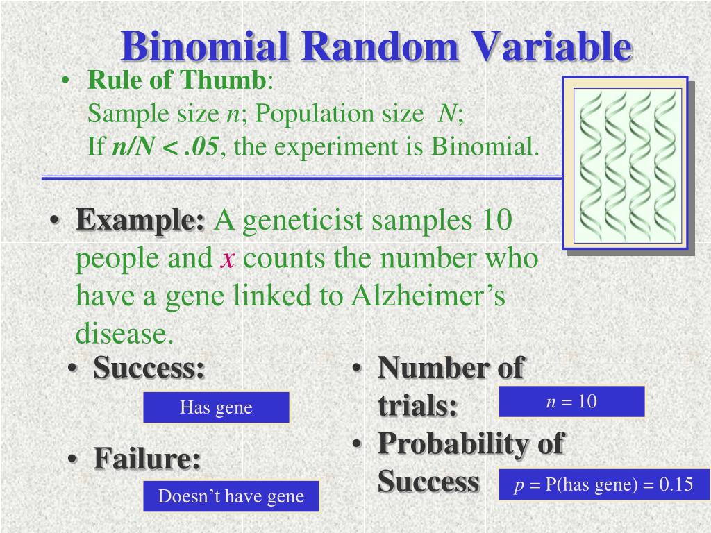 Success: • Failure: • Number of • trials: • Probability of Success Binomial Random Variable • Rule of Thumb: Sample size n; Population size N; If n/N < .05, the experiment is Binomial. • Example: A geneticist samples 10 people and x counts the number who have a gene linked to Alzheimer’s disease. n = 10 Has gene p = P(has gene) = 0.15 Doesn’t have gene