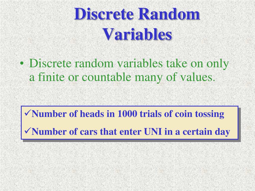 Discrete Random Variables • Discrete random variables take on only a finite or countable many of values. • Number of heads in 1000 trials of coin tossing • Number of cars that enter UNI in a certain day