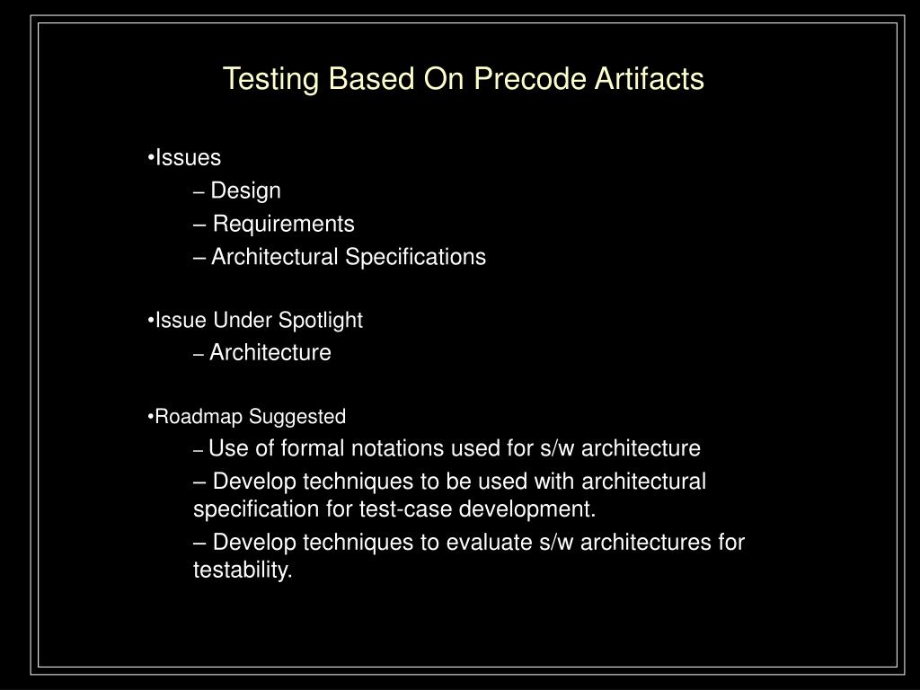 Testing Based On Precode Artifacts Issues Design Requirements Architectural Specifications Issue Under Spotlight Architecture Roadmap Suggested Use of formal notations used for s/w architecture Develop techniques to be used with architectural specification for test-case development. Develop techniques to evaluate s/w architectures for testability.