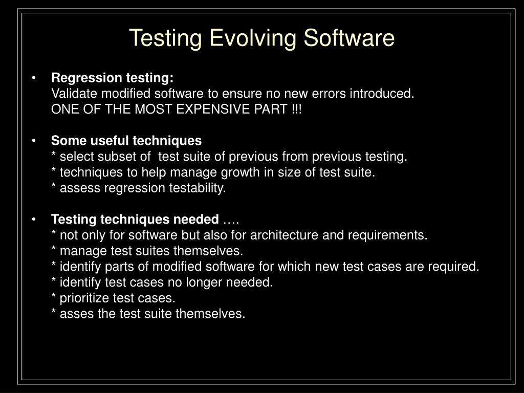 Testing Evolving Software • Regression testing: Validate modified software to ensure no new errors introduced. ONE OF THE MOST EXPENSIVE PART !!! • Some useful techniques * select subset of test suite of previous from previous testing. * techniques to help manage growth in size of test suite. * assess regression testability. • Testing techniques needed …. * not only for software but also for architecture and requirements. * manage test suites themselves. * identify parts of modified software for which new test cases are required. * identify test cases no longer needed. * prioritize test cases. * asses the test suite themselves.