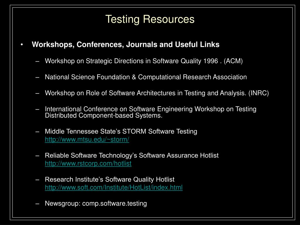 Testing Resources • Workshops, Conferences, Journals and Useful Links • Workshop on Strategic Directions in Software Quality 1996 . (ACM) • National Science Foundation & Computational Research Association • Workshop on Role of Software Architectures in Testing and Analysis. (INRC) • International Conference on Software Engineering Workshop on Testing Distributed Component-based Systems. • Middle Tennessee State’s STORM Software Testing http://www.mtsu.edu/~storm/ • Reliable Software Technology’s Software Assurance Hotlist http://www.rstcorp.com/hotlist • Research Institute’s Software Quality Hotlist http://www.soft.com/Institute/HotList/index.html • Newsgroup: comp.software.testing