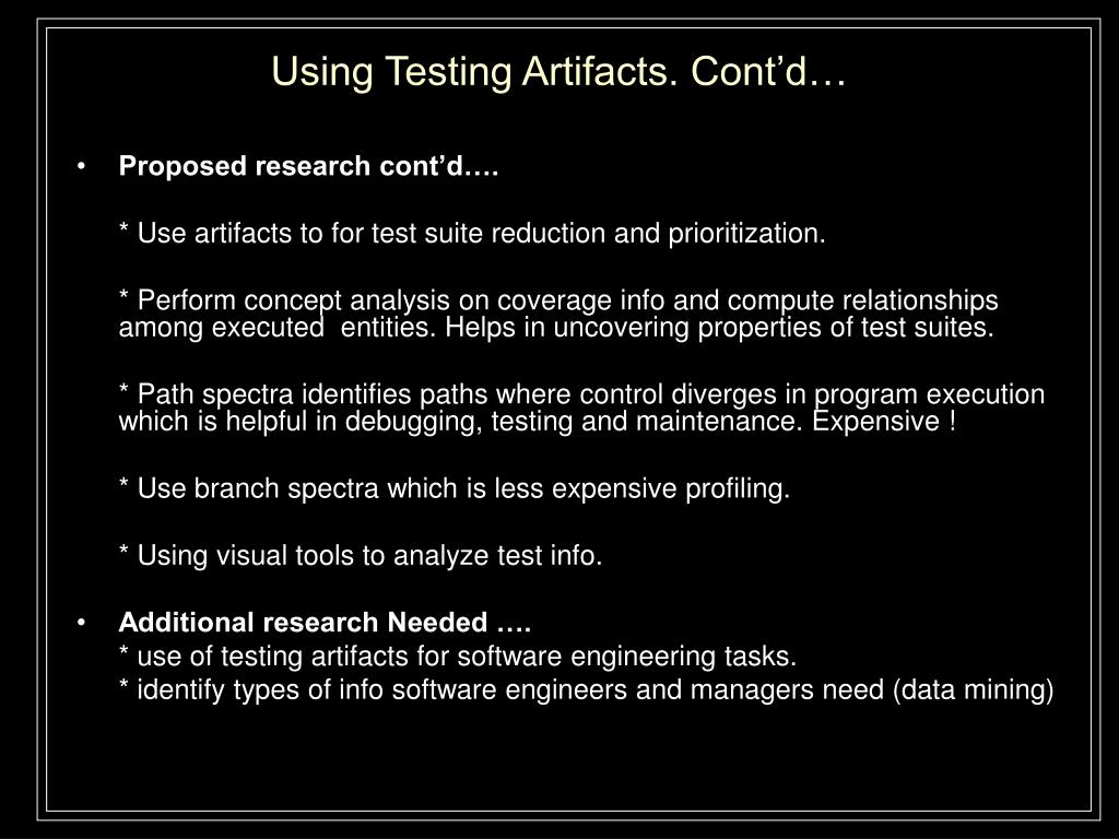 Using Testing Artifacts. Cont’d… • Proposed research cont’d…. * Use artifacts to for test suite reduction and prioritization. * Perform concept analysis on coverage info and compute relationships among executed entities. Helps in uncovering properties of test suites. * Path spectra identifies paths where control diverges in program execution which is helpful in debugging, testing and maintenance. Expensive ! * Use branch spectra which is less expensive profiling. * Using visual tools to analyze test info. • Additional research Needed …. * use of testing artifacts for software engineering tasks. * identify types of info software engineers and managers need (data mining)