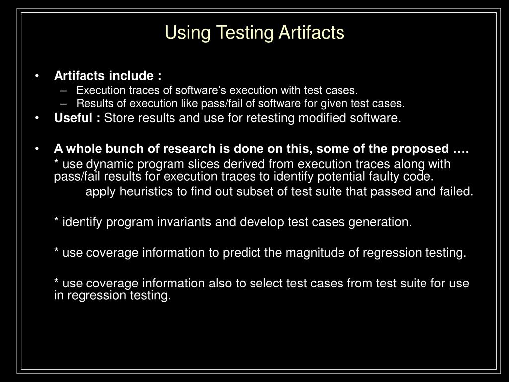 Using Testing Artifacts • Artifacts include : • Execution traces of software’s execution with test cases. • Results of execution like pass/fail of software for given test cases. • Useful : Store results and use for retesting modified software. • A whole bunch of research is done on this, some of the proposed …. * use dynamic program slices derived from execution traces along with pass/fail results for execution traces to identify potential faulty code. apply heuristics to find out subset of test suite that passed and failed. * identify program invariants and develop test cases generation. * use coverage information to predict the magnitude of regression testing. * use coverage information also to select test cases from test suite for use in regression testing.