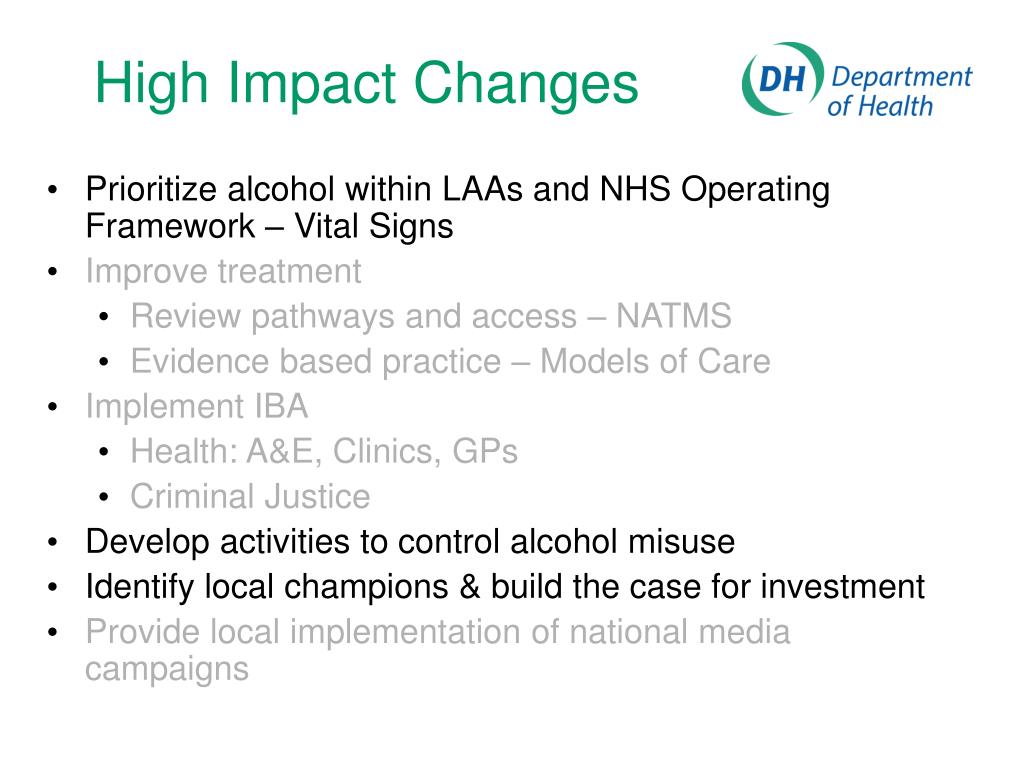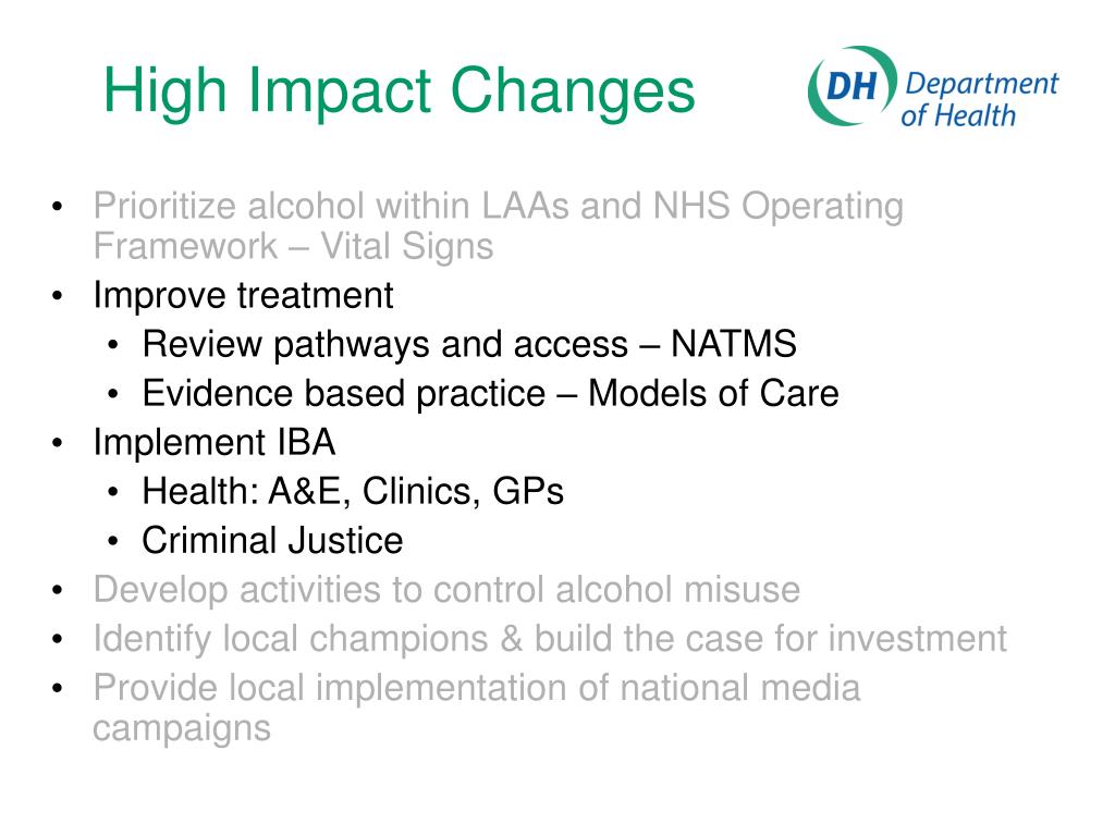High Impact Changes. High Impact Changes. Prioritize alcohol within LAAs and NHS Operating Framework – Vital Signs Improve treatment Review pathways and access – NATMS Evidence based practice – Models of Care Implement IBA Health: A&E, Clinics, GPs Criminal Justice