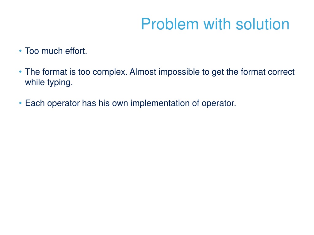 Problem with solution • Too much effort. • The format is too complex. Almost impossible to get the format correct while typing. • Each operator has his own implementation of operator.