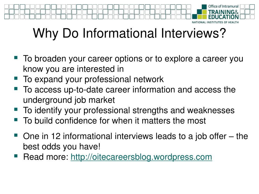 Why Do Informational Interviews? • To broaden your career options or to explore a career you know you are interested in • To expand your professional network • To access up-to-date career information and access the underground job market • To identify your professional strengths and weaknesses • To build confidence for when it matters the most • One in 12 informational interviews leads to a job offer – the best odds you have! • Read more: http://oitecareersblog.wordpress.com