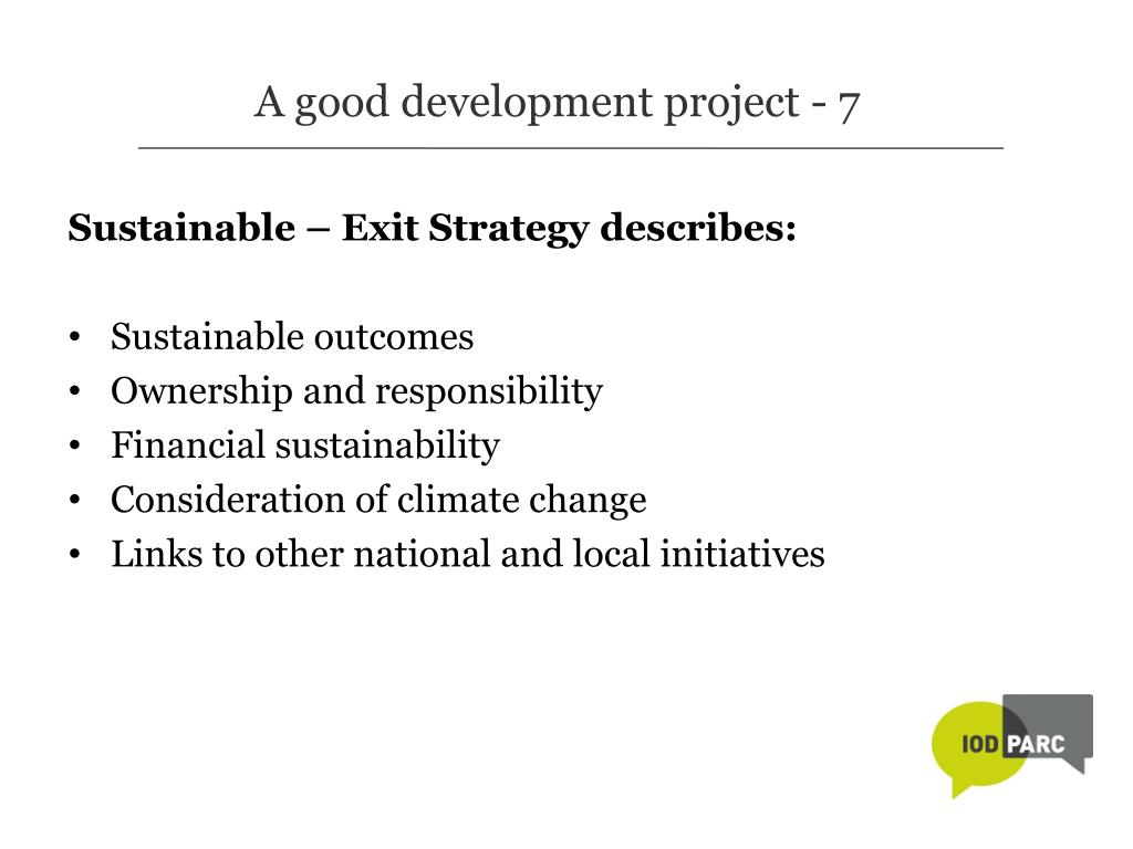 Sustainable – Exit Strategy describes: Sustainable outcomes Ownership and responsibility Financial sustainability Consideration of climate change Links to other national and local initiatives A good development project - 7