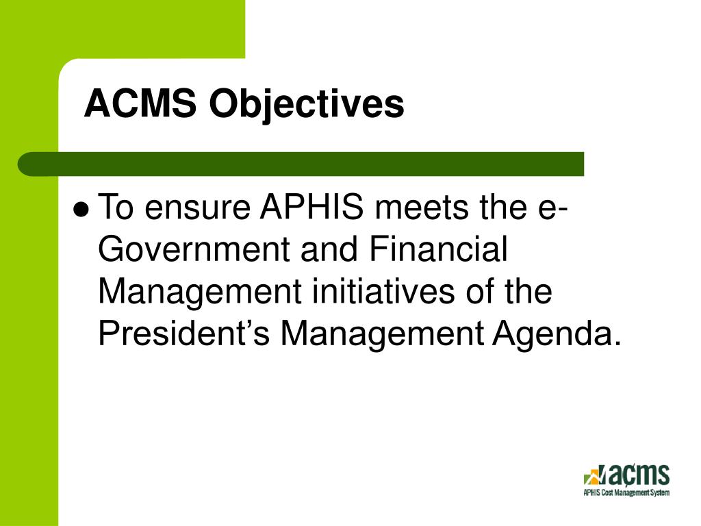 APHIS Cost Management System. Agency Goal. To provide a relevant Status of Funds and be able to substantiate it in an audit any time, any place. ACMS Objectives. To ensure APHIS meets the e-Government and Financial Management initiatives of the President’s Management Agenda.