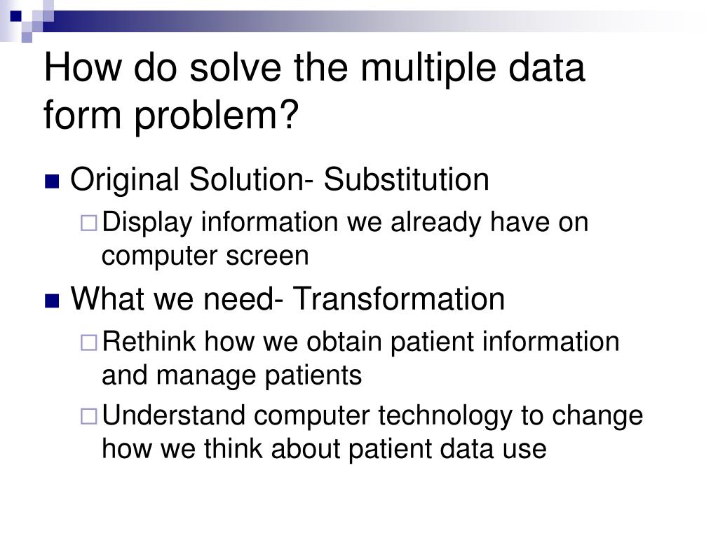How do solve the multiple data form problem? • Original Solution- Substitution • Display information we already have on computer screen • What we need- Transformation • Rethink how we obtain patient information and manage patients • Understand computer technology to change how we think about patient data use