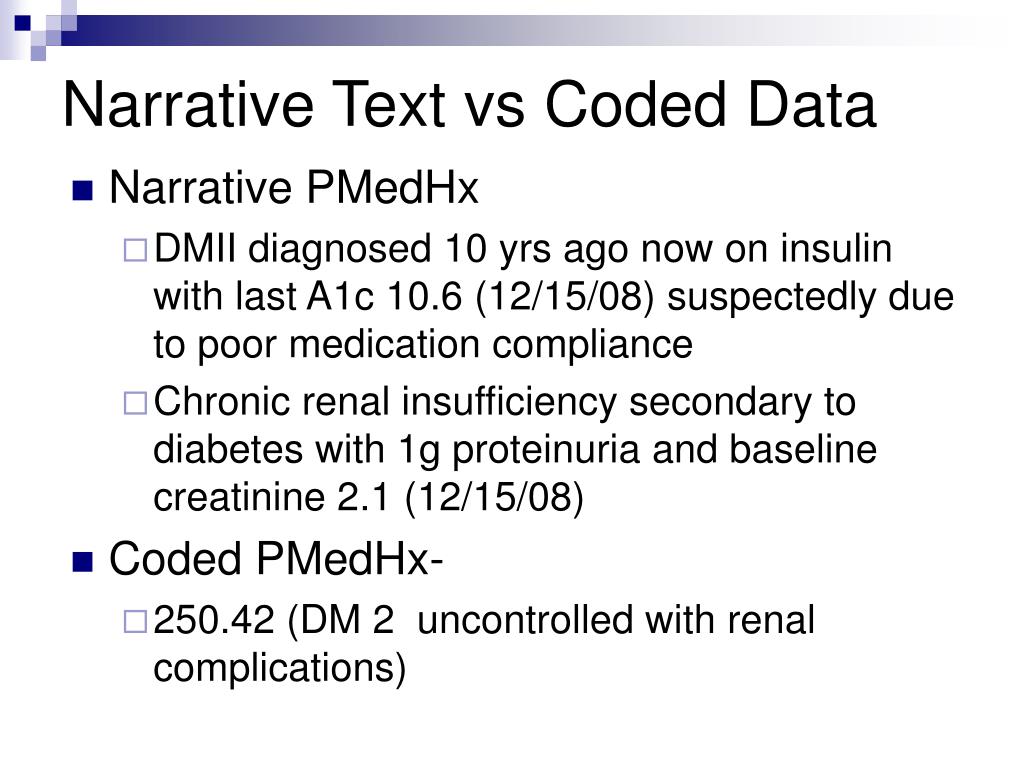 Narrative Text vs Coded Data • Narrative PMedHx • DMII diagnosed 10 yrs ago now on insulin with last A1c 10.6 (12/15/08) suspectedly due to poor medication compliance • Chronic renal insufficiency secondary to diabetes with 1g proteinuria and baseline creatinine 2.1 (12/15/08) • Coded PMedHx- • 250.42 (DM 2 uncontrolled with renal complications)