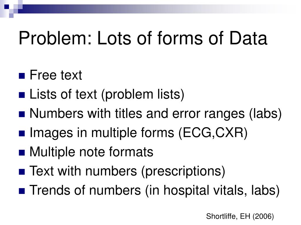 Problem: Lots of forms of Data • Free text • Lists of text (problem lists) • Numbers with titles and error ranges (labs) • Images in multiple forms (ECG,CXR) • Multiple note formats • Text with numbers (prescriptions) • Trends of numbers (in hospital vitals, labs) Shortliffe, EH (2006)