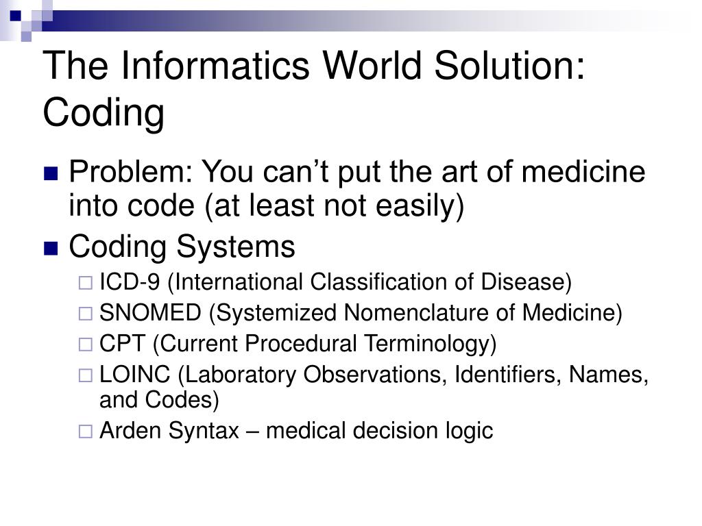 The Informatics World Solution: Coding • Problem: You can’t put the art of medicine into code (at least not easily) • Coding Systems • ICD-9 (International Classification of Disease) • SNOMED (Systemized Nomenclature of Medicine) • CPT (Current Procedural Terminology) • LOINC (Laboratory Observations, Identifiers, Names, and Codes) • Arden Syntax – medical decision logic