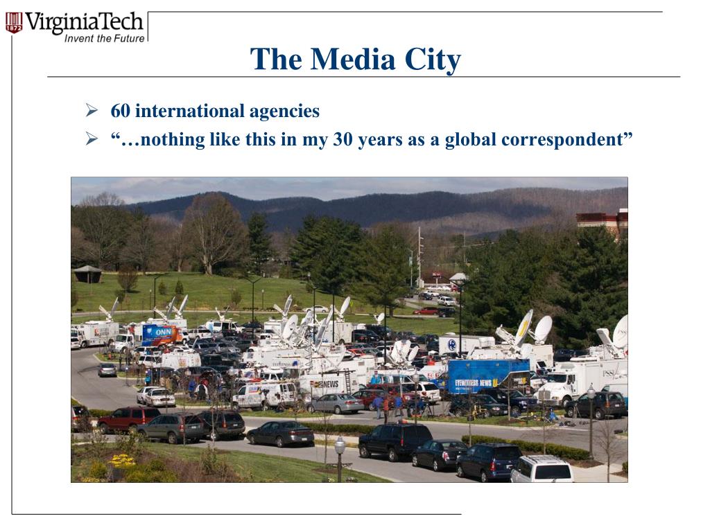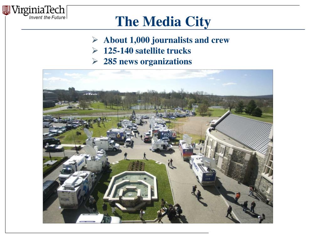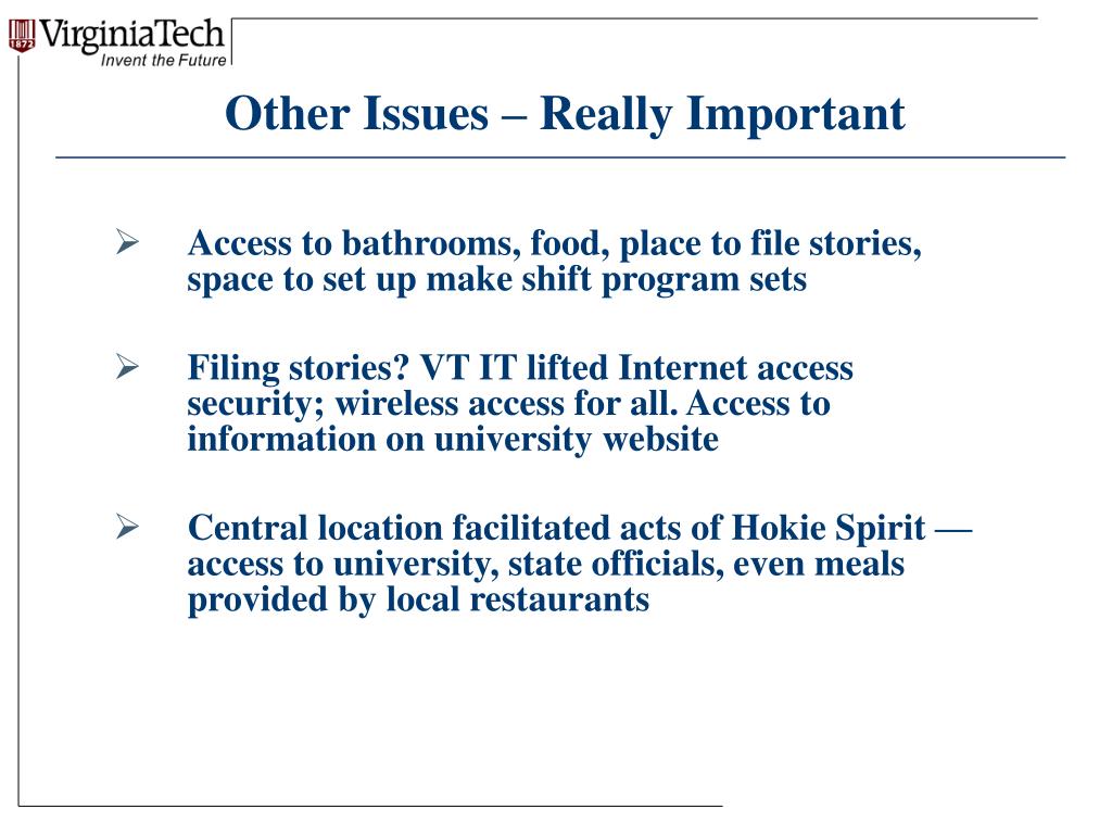 Other Issues – Really Important • Access to bathrooms, food, place to file stories, space to set up make shift program sets • Filing stories? VT IT lifted Internet access security; wireless access for all. Access to information on university website • Central location facilitated acts of HokieSpirit —access to university, state officials, even meals provided by local restaurants