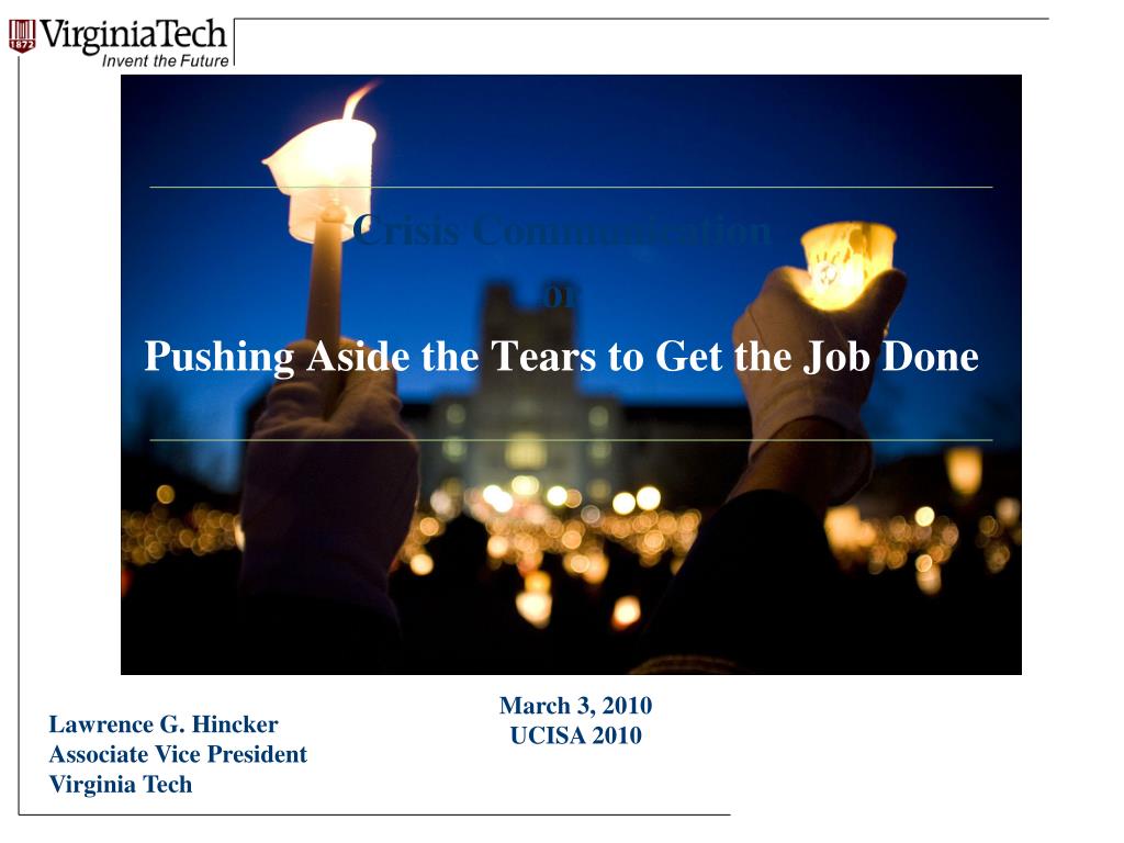 Crisis Communication or Pushing Aside the Tears to Get the Job Done March 3, 2010 UCISA 2010 Lawrence G. Hincker Associate Vice President Virginia Tech