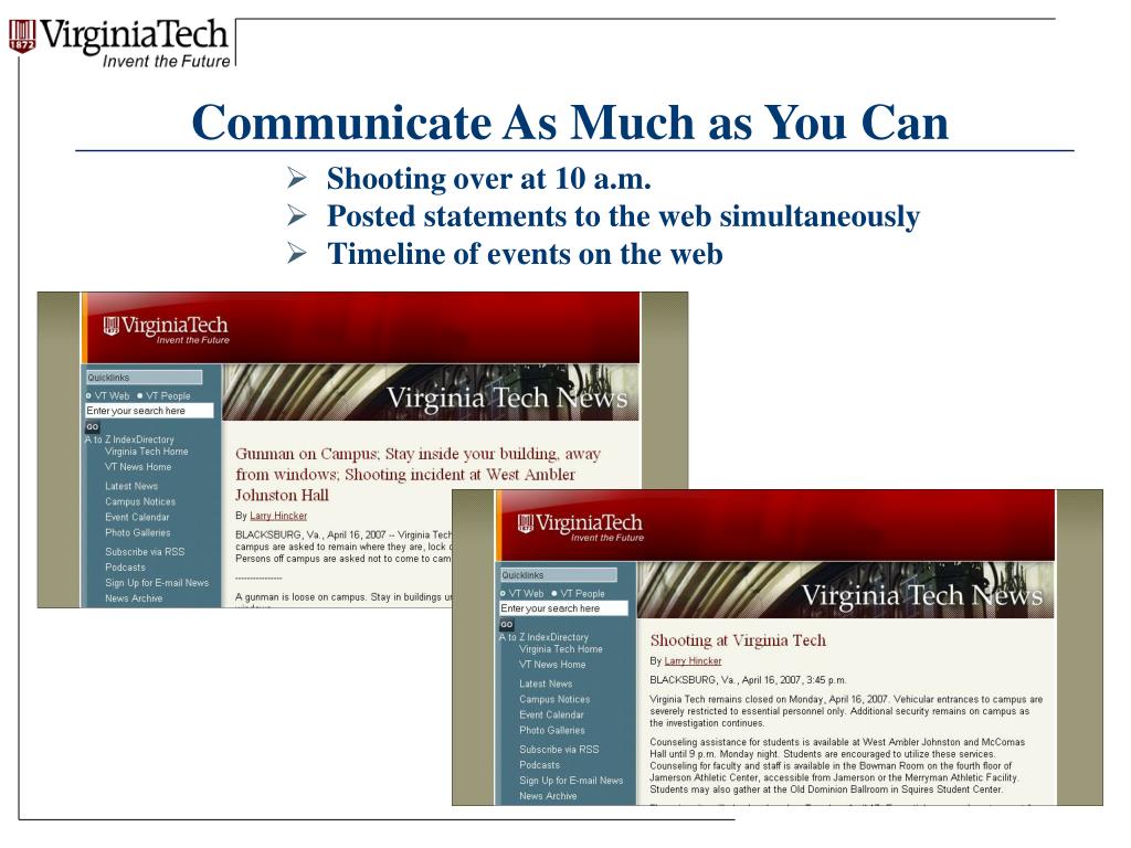 Communicate As Much as You Can • Shooting over at 10 a.m. • Posted statements to the web simultaneously • Timeline of events on the web