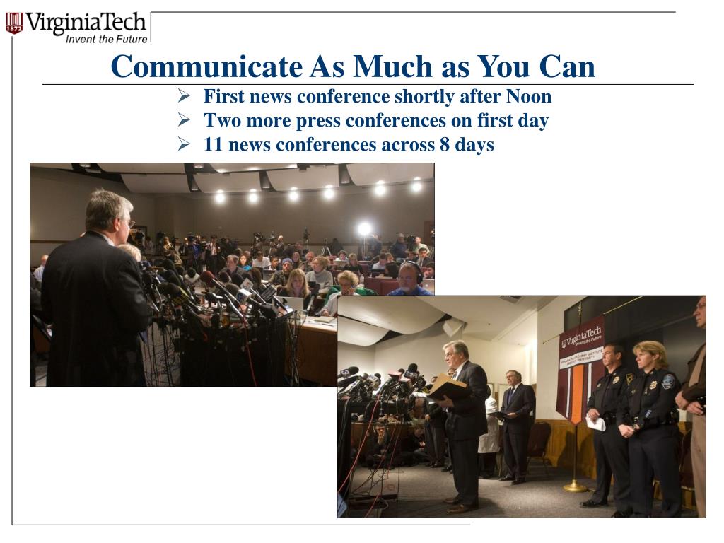 Communicate As Much as You Can • First news conference shortly after Noon • Two more press conferences on first day • 11 news conferences across 8 days