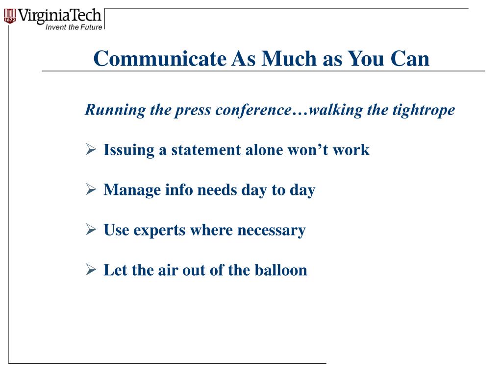 Communicate As Much as You Can Running the press conference…walking the tightrope • Issuing a statement alone won’t work • Manage info needs day to day • Use experts where necessary • Let the air out of the balloon