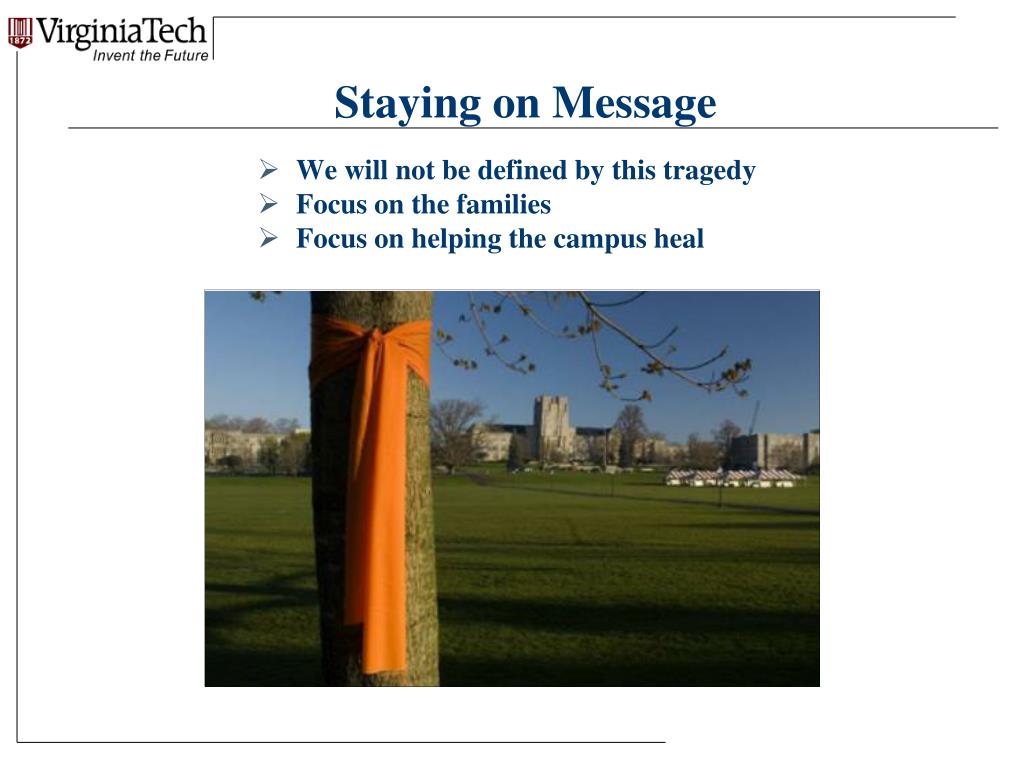 Staying on Message • We will not be defined by this tragedy • Focus on the families • Focus on helping the campus heal