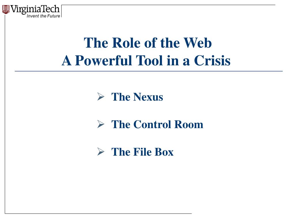 The Role of the Web A Powerful Tool in a Crisis • The Nexus • The Control Room • The File Box