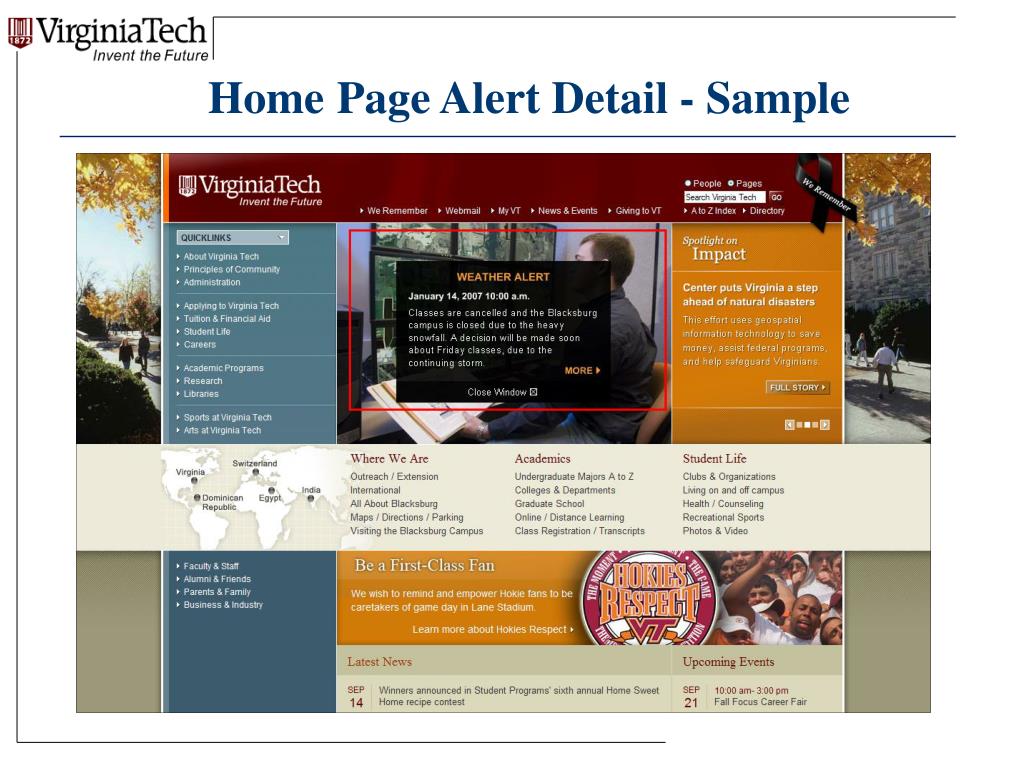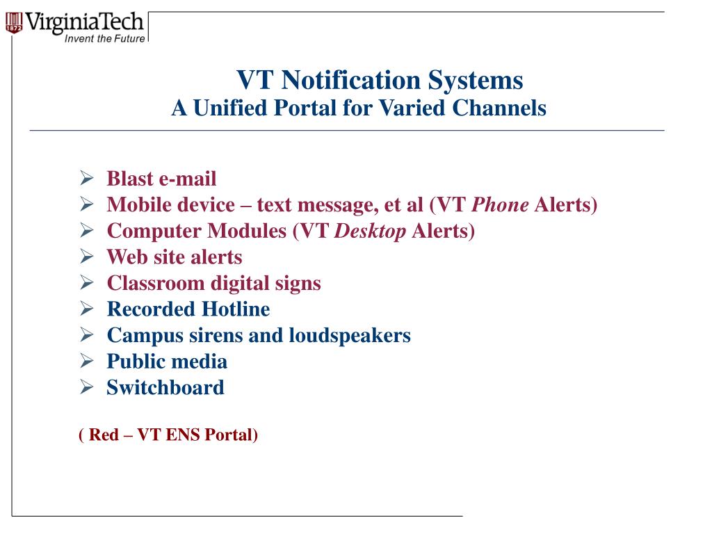 A Unified Portal for Varied Channels VT Notification Systems • Blast e-mail • Mobile device – text message, et al (VT Phone Alerts) • Computer Modules (VT Desktop Alerts) • Web site alerts • Classroom digital signs • Recorded Hotline • Campus sirens and loudspeakers • Public media • Switchboard ( Red – VT ENS Portal)