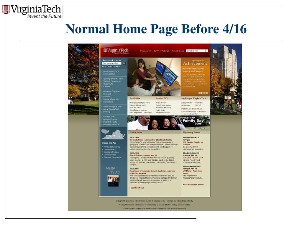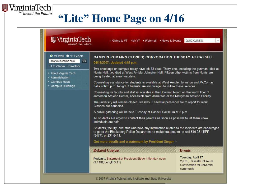 Other Things We Decided • Think multimedia; think Web 2.0 • Put students and families first in all decisions • Choose words carefully to aid healing • Find ways to engage the community • Create condolences/thoughts/prayers website • Post messages from other universities • Set up live video streaming for Convocation • Relocate webcam to stream Candlelight Vigil