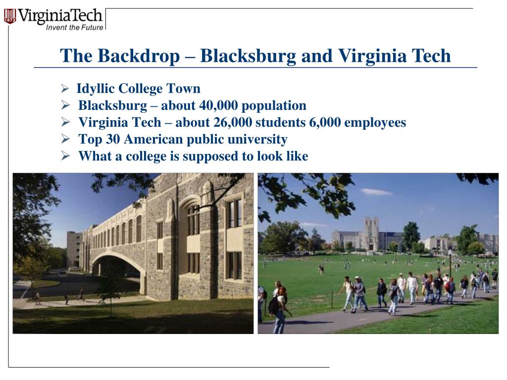 The Backdrop – Blacksburg and Virginia Tech • Idyllic College Town • Blacksburg – about 40,000 population • Virginia Tech – about 26,000 students 6,000 employees • Top 30 American public university • What a college is supposed to look like