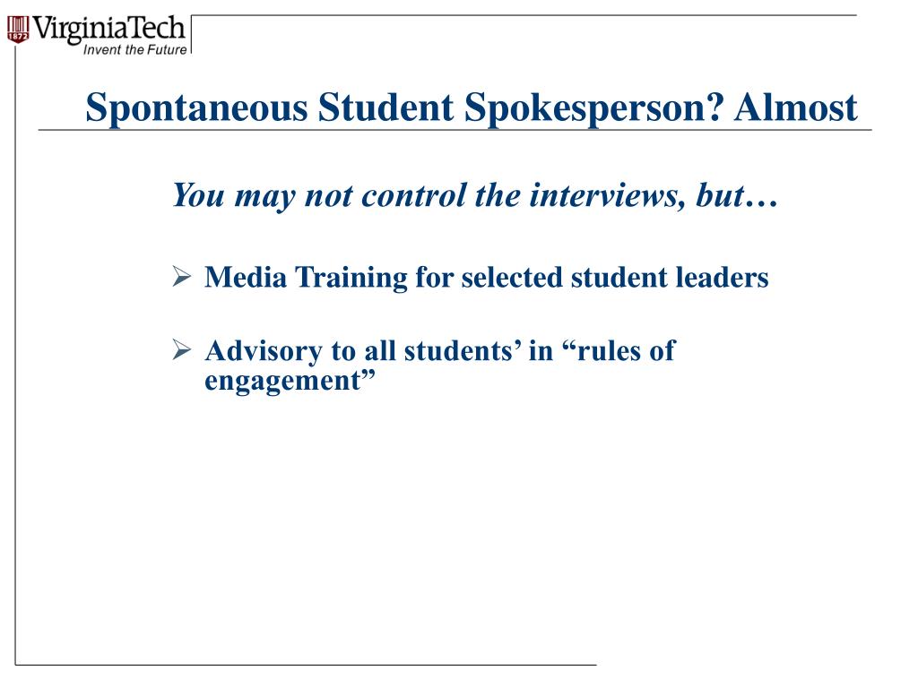 Spontaneous Student Spokesperson? Almost You may not control the interviews, but… • Media Training for selected student leaders • Advisory to all students’ in “rules of engagement”