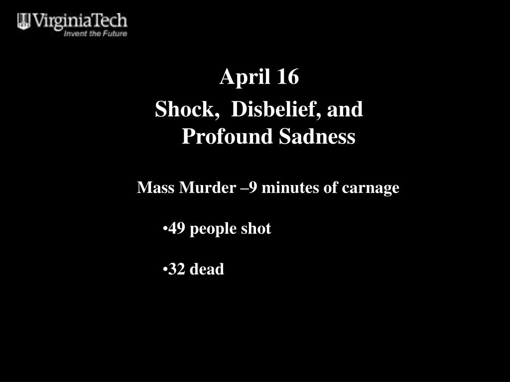 April 16 Shock, Disbelief, and Profound Sadness • Mass Murder –9 minutes of carnage • 49 people shot • 32 dead