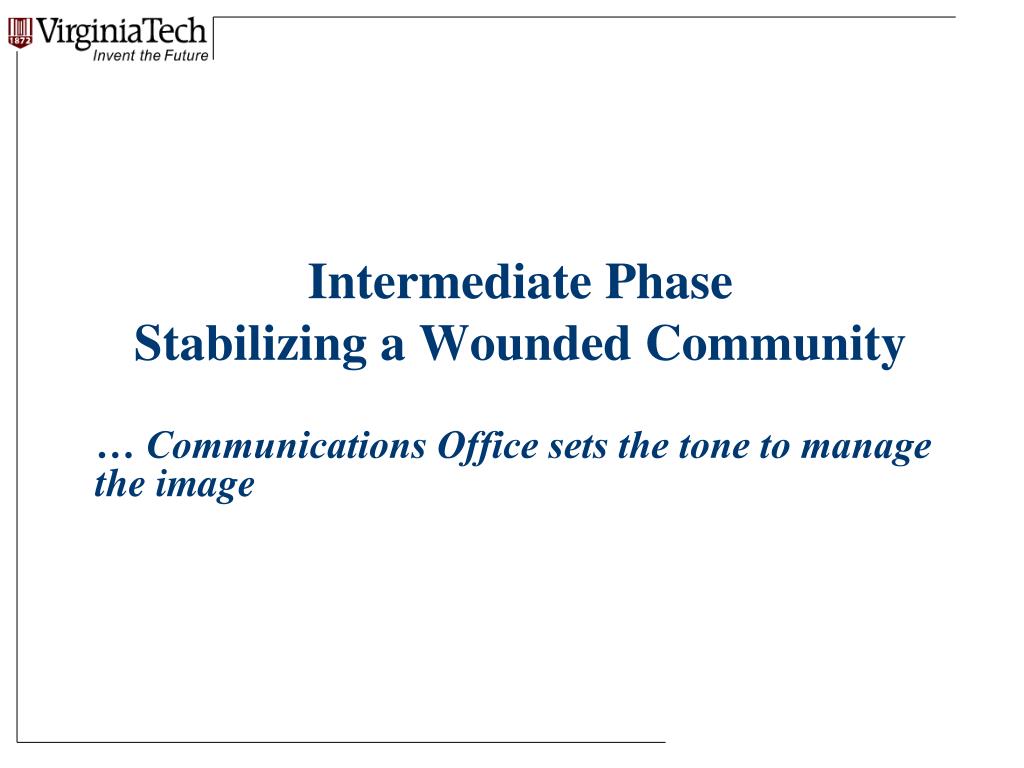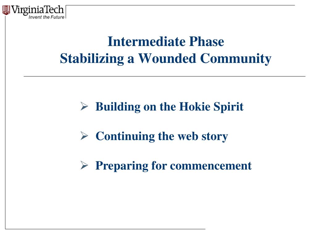 Intermediate Phase Stabilizing a Wounded Community • Building on the Hokie Spirit • Continuing the web story • Preparing for commencement