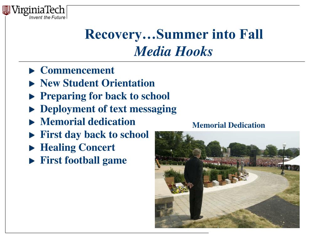 Recovery…Summer into Fall Media Hooks Commencement New Student Orientation Preparing for back to school Deployment of text messaging Memorial dedication First day back to school Healing Concert First football game Memorial Dedication