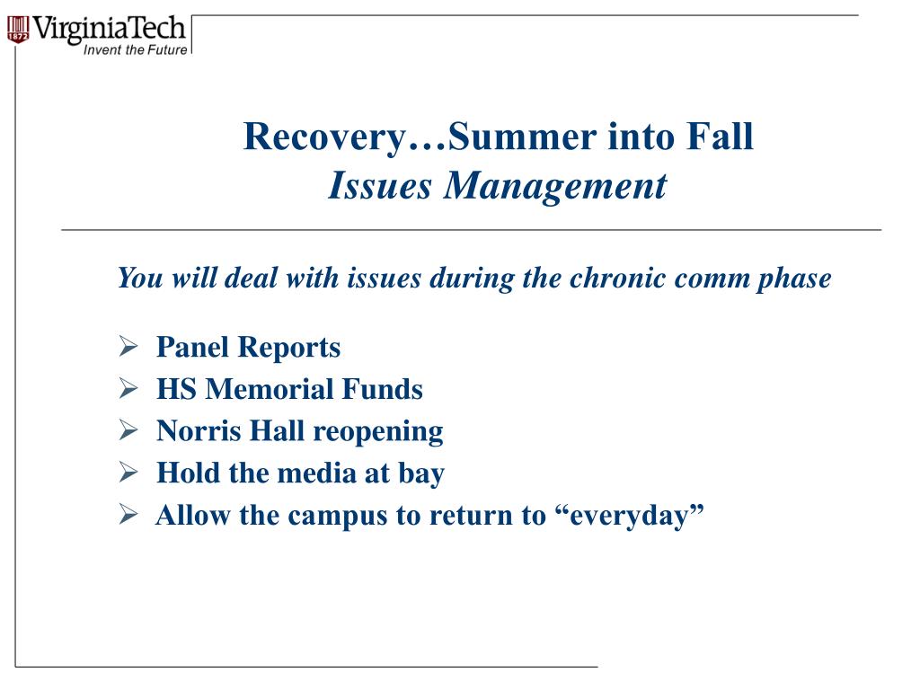 Recovery…Summer into Fall Issues Management You willdeal with issues during the chronic comm phase • Panel Reports • HS Memorial Funds • Norris Hall reopening • Hold the media at bay • Allow the campus to return to “everyday”