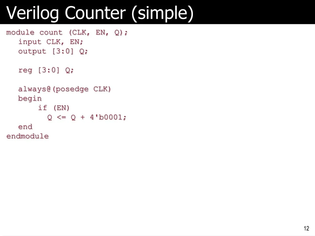 Verilog Counter (simple) module count (CLK, EN, Q); input CLK, EN; output [3:0] Q; reg [3:0] Q; always@(posedge CLK) begin if (EN) Q <= Q + 4'b0001; end endmodule