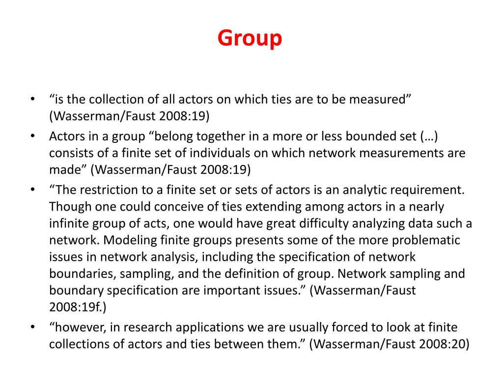 Group • “is the collection of all actors on which ties are to be measured” (Wasserman/Faust 2008:19) • Actors in a group “belong together in a more or less bounded set (…) consists of a finite set of individuals on which network measurements are made” (Wasserman/Faust 2008:19) • “The restriction to a finite set or sets of actors is an analytic requirement. Though one could conceive of ties extending among actors in a nearly infinite group of acts, one would have great difficulty analyzing data such a network. Modeling finite groups presents some of the more problematic issues in network analysis, including the specification of network boundaries, sampling, and the definition of group. Network sampling and boundary specification are important issues.” (Wasserman/Faust 2008:19f.) • “however, in research applications we are usually forced to look at finite collections of actors and ties between them.” (Wasserman/Faust 2008:20)
