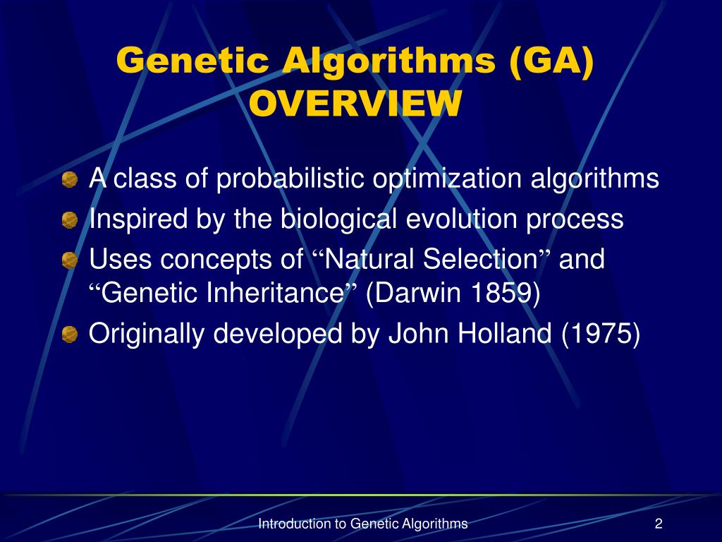 Genetic Algorithms (GA) OVERVIEW • A class of probabilistic optimization algorithms • Inspired by the biological evolution process • Uses concepts of “Natural Selection” and “Genetic Inheritance” (Darwin 1859) • Originally developed by John Holland (1975) Introduction to Genetic Algorithms
