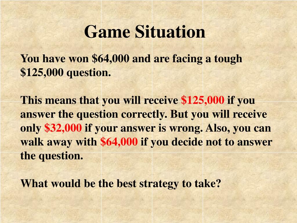 Game Situation You have won $64,000 and are facing a tough $125,000 question. This means that you will receive $125,000 if you answer the question correctly. But you will receive only $32,000 if your answer is wrong. Also, you can walk away with $64,000 if you decide not to answer the question. What would be the best strategy to take?