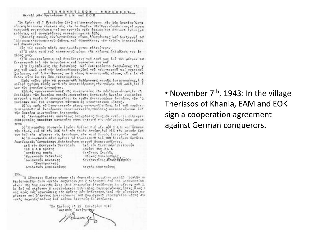 November 7th, 1943: In the village Therissos of Khania, ΕΑΜ and ΕΟΚ sign a cooperation agreement against German conquerors.